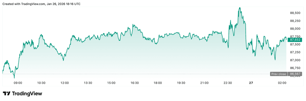 Bitcoin (BTC) was priced at US$87,596.95, trading flat over 24 hours.