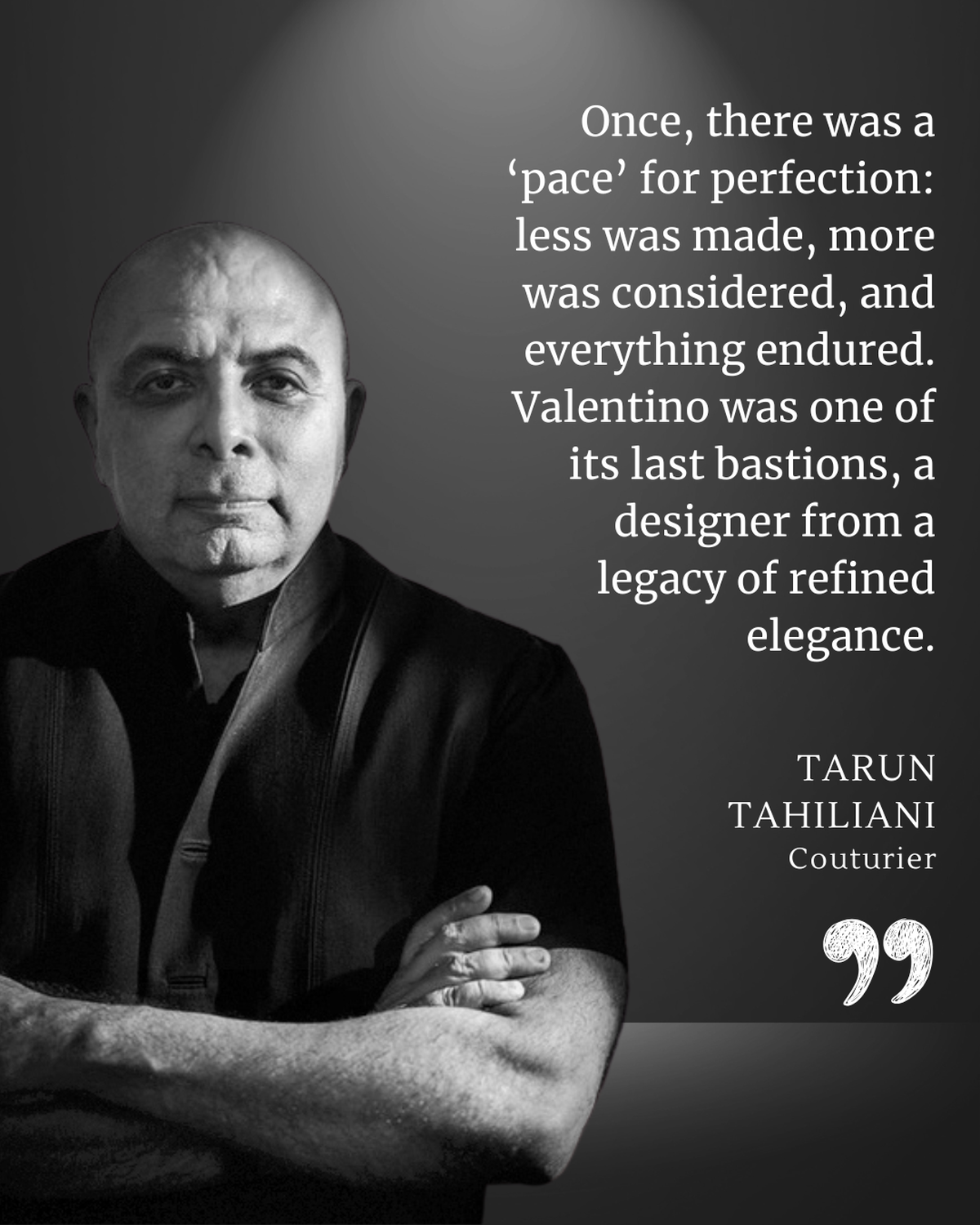 Once, there was a ‘pace’ for perfection: less was made, more was considered, and everything endured. Valentino was one of its last bastions, a designer from a legacy of refined elegance. The idea of beauty and elegance did not change in this gilded world; hemlines could go anywhere, but the codes represented remained intact. They understood the symbolism and luxury of it all. No logos needed, thank you! That was vulgar, tasteless and nouveau. After all, as Minal Modi (wife of former IPL chairman Lalit Modi) once said, “My hand, and not the logo, will tell me if a bag is luxury when I slip it in. It knows what makes the cut.”