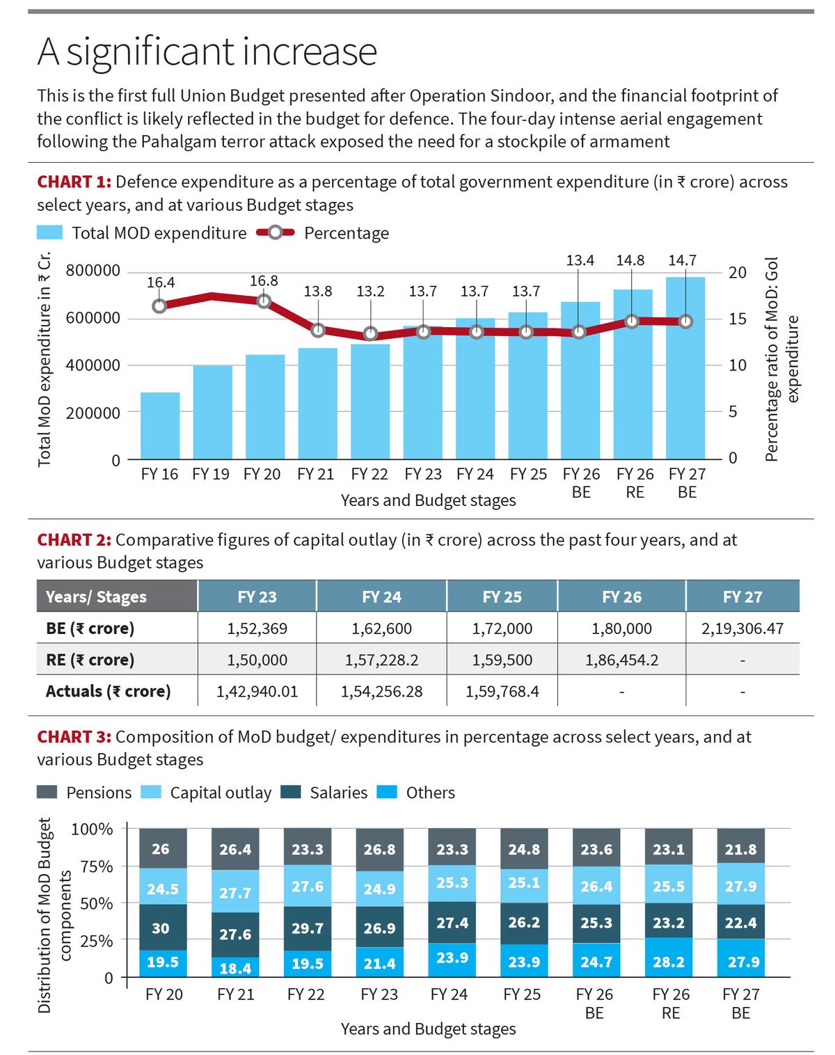 Firstly, this is the first full Union Budget presented after Operation Sindoor, and the financial footprint of that conflict is likely reflected in the demands for grants. The four-day intense aerial engagement following the Pahalgam terror attack exposed the need for a stockpile of armament such as precision-guided munitions (PGMs) and loitering munitions, especially if the Indian armed forces are to prepare for a two-front challenge involving both China and Pakistan. In that regard, it is possible that the 21.8% jump in capital outlay is not just for future-proofing, but also for the replenishment of the war wastage reserves depleted in May 2025.